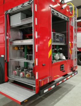 3.1 | 結構設計:鋼制框架和鋁合金型材專用連接件結構。合理設計并增加器材放置空間,放置器材隔斷空間可調整。對車廂內部需要經常檢測的部件,在適當部位須安有活門,其他需要進入車內部檢查和維修的地方也應敞開或有可移動的板;器材箱應具有排水功能。具有自重輕、強度高,外觀平整美觀, 內部空間調整方便、空間利用率高、維護便捷等特點;主線路布置在骨架型材板內,可安全保護、防止損壞;內飾底板為3mm厚的氧化鋁花紋板,通過具有彈性、高粘接強度的進口連接密封膠與主骨架連接;前部器材箱、中部罐體、泵室位于車輛尾部。 |